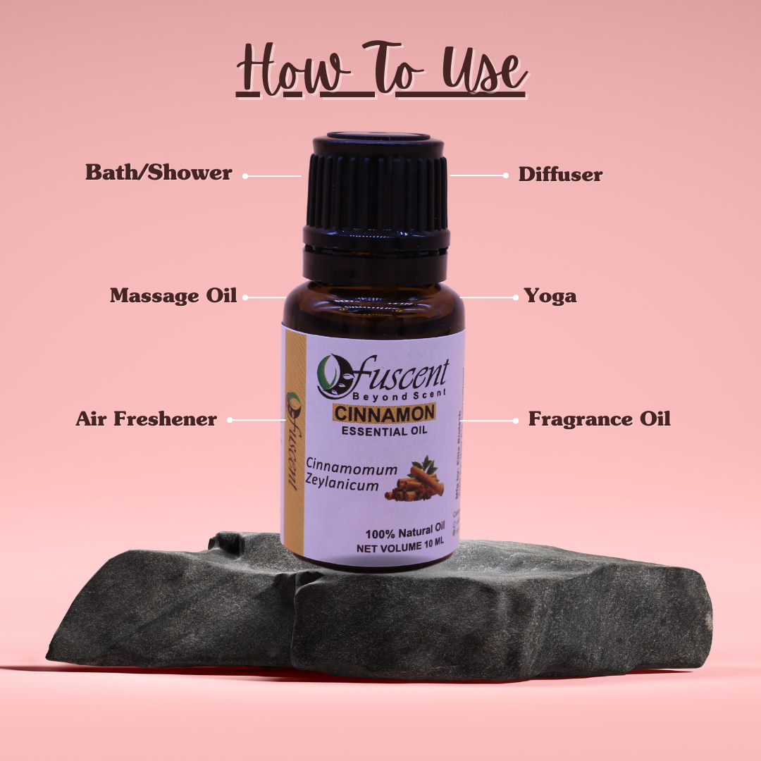 USAGE: For a refreshing atmosphere, add a few drops of Cinnamon Essential Oil to a water-based solution, shake well, and spray into the air to deodorize the room or set the perfect mood.