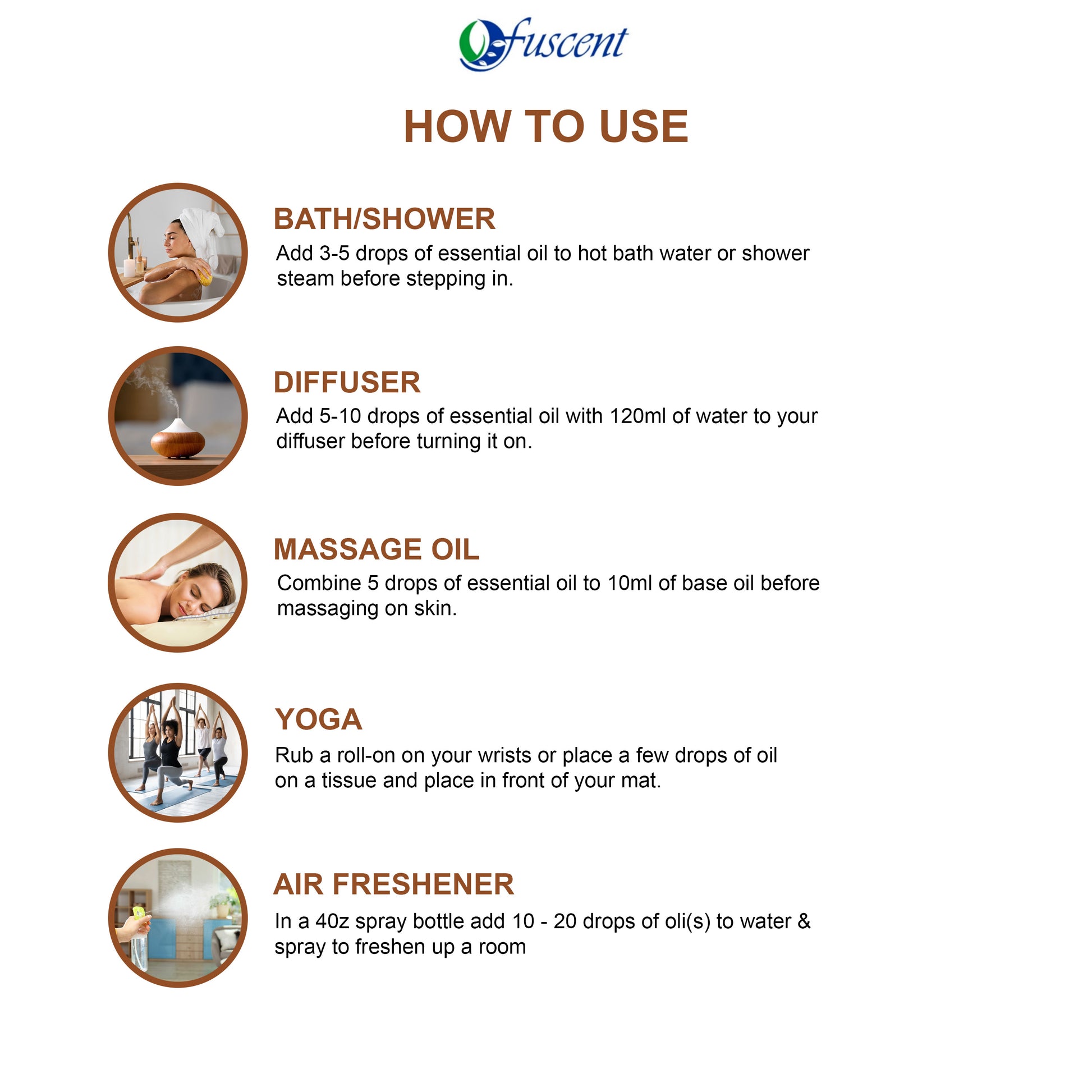 WHO WE ARE: At Fuscent, we are committed to bringing natural healing to your life. Our essential oils are carefully curated to help you unwind and release the stresses of the day. We believe in simple, pure solutions designed to enhance your well-being and bring balance into your world.